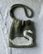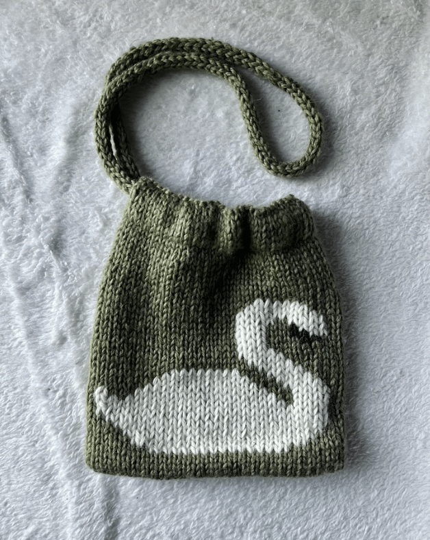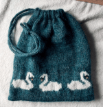 The Leda Bag is a drawstring bag featuring a swan colourwork motif available in a variety of sizes. Choose from a small or large swan motif and individual swans facing the same direction or lover swans, facing each other. Whether you want a small pouch to carry along lucky trinkets, or to stash shells you find along the beach, a bag to carry along your favourite book, or a large project bag for your current work in progress, there is a size for your every desire. Knit from the top down in the round, the drawstring closer is knit first, followed by stockinette to create the majority of the bag’s depth. The chosen swan colourwork motif is knit, followed by additional stockinette to complete the depth of the bag. The bottom opening is seamed closed. An i-cord drawstring is knit and inserted into the drawstring closure through previously worked drawstring holes. You have the option to duplicate stitch additional details on the swan motif and to reinforce the drawstring holes using a crochet hook. Modification options for height adjustment, width adjustment, and differing yarn weights are provided.